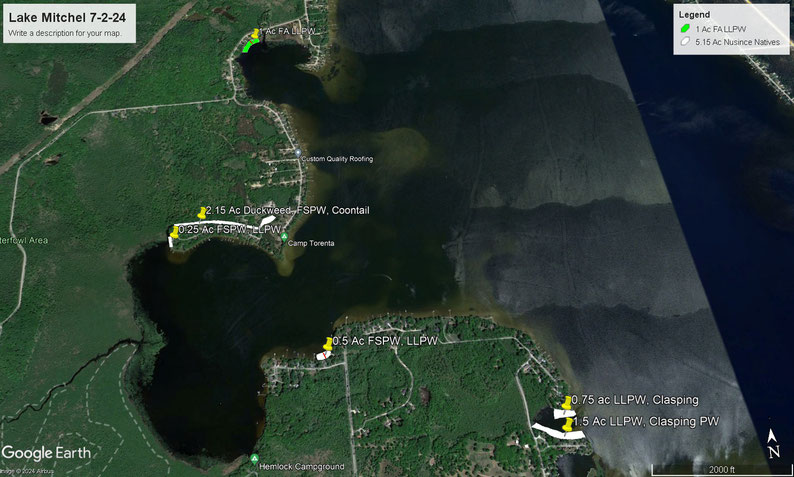 This is the treatment map for Lake Mitchel from the July 2, 2024 survey. Only a few locations of nuisance natives impacting the shoreline and recreational impediments. The EWM has been very well controlled at this point in time and only a few locations of A and B level density but not definitive enough to justify treating at this time.